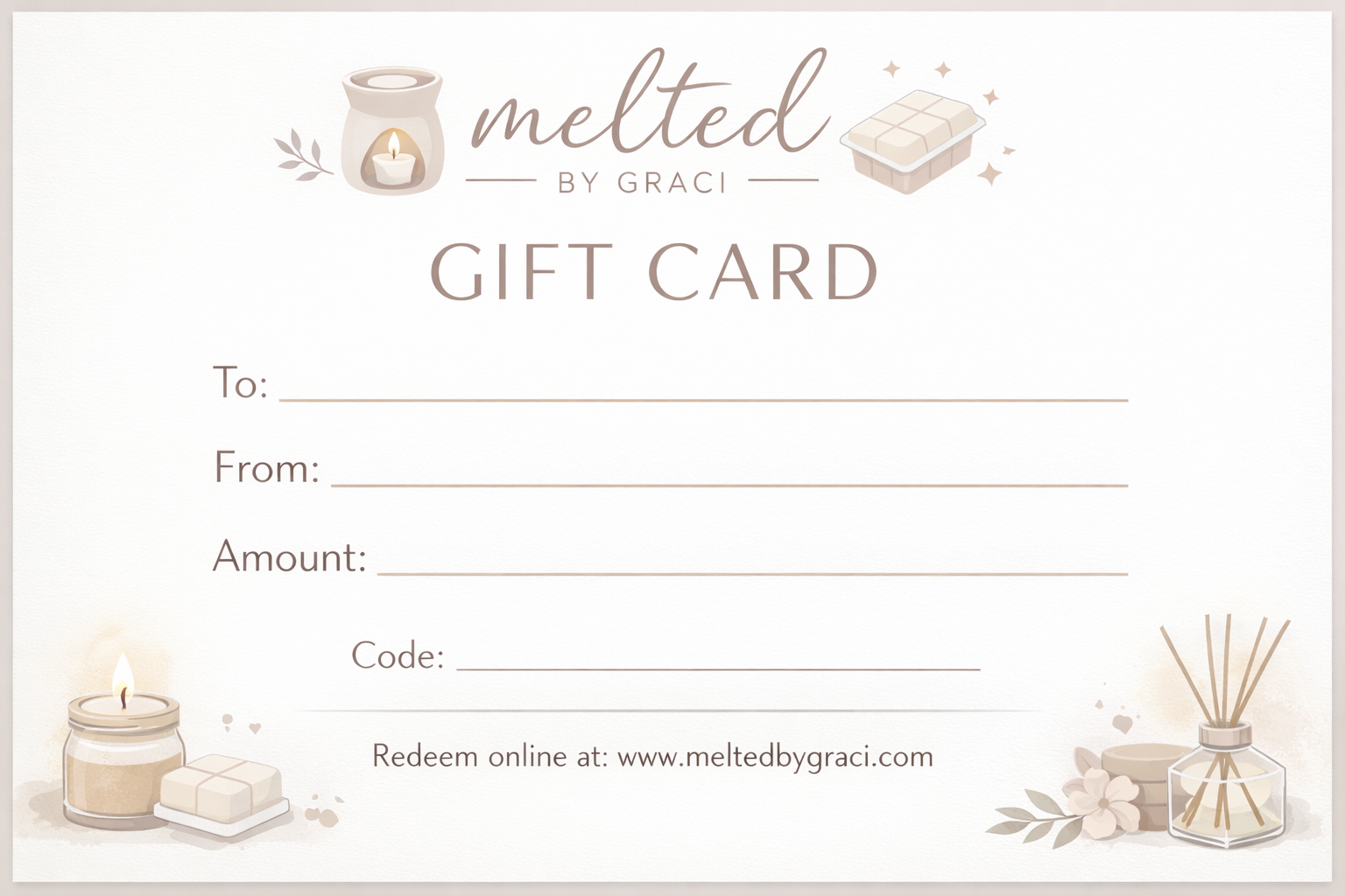 This gift card is good for any melted by graci products. Wax melts, room sprays, candles, car fresheners.